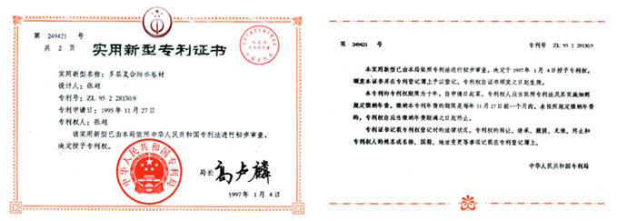 •  多層復(fù)合防水材料專利證書